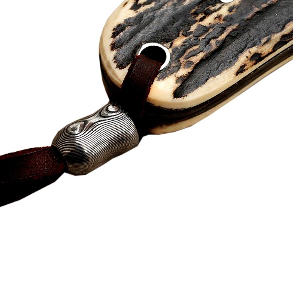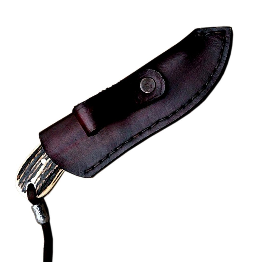 This knife is a unique knife, as it is custom made, so grab yourself a bargain to get this splendid knife. This knife is not only stunning in appearance but it also got rock solid construction. Blade of this knife is the result of hours and hours of forging. The Damascus blade of this knife is hand forged with high carbon steels in the fantastic pattern. Not many custom makers can keep such pattern of layers upon layers flowing all the way to the edge, having saw blade effect at a microscopic level which allows the blade to keep cutting for longer period of time where other blades have dulled. Strong 5 mm thick blade has superb hand grinds on both sides. The handle of this elegant knife is made of stag Horn with brass bolsters. Its finest fit and finish make this knife very special. This knife is completed with a hand sewn high-quality leather sheath. It is custom made especially for this knife, Hand sewed to provide a perfect fit and finish for this specific knife. Thick leather is used to give the knife extra protection from the rough and harsh environment to sheath this sheath can also be worn on a belt.