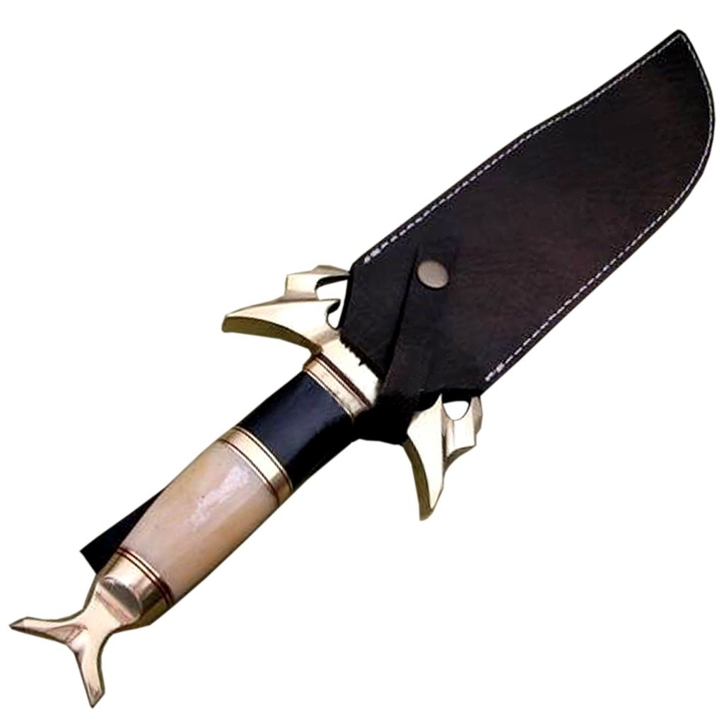 This fantastic Bowie knife is a piece of art, with its excellent finish and dashing looks it also got a rock solid construction. Its wonderful blade is the result of hours and hours of hammer forging. The shape and the whole geometry are simply awesome. Blade of this knife was hand forged with high carbon steel layers forged into an excellent pattern. The blade is hand ground on both sides its spine is beautifully hand file worked and has a fabulous pattern. Fantastic rock solid handle is made of a solid piece of buffalo horn, camel bone and brass pieces with brass and fiber spacers bonded together. It has also got a fantastic huge bras handguard to make a master piece of a kind. This knife is completed with a hand sewn high-quality leather sheath. It is custom made especially for this knife, Hand sewed to provide a perfect fit and finish for this specific knife. Thick leather is used to give the knife extra protection from the rough and harsh environment to sheath this sheath can also be worn on a belt.