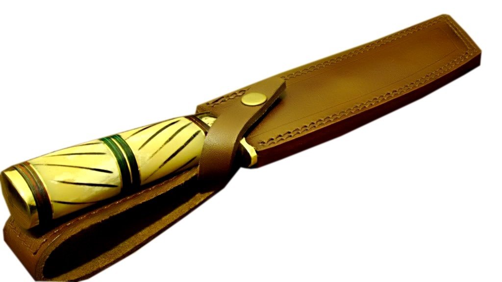 This fantastic knife is a piece of art, with its excellent finish and dashing looks it also got a rock solid construction. Its wonderful blade is the result of hours and hours of hammer forging. The shape and the whole geometry are simply awesome. Blade of this knife was hand forged with high carbon steel layers forged into an excellent pattern. The blade is hand grinned on both sides and the spine of the blade is nicely hand file worked and possess a fabulous Tanto shape. Fantastic rock solid handle is made of a piece of Handcrafted Bone with brass and fiber spacers bonded together to the made masterpiece of a kind. This knife is completed with a hand sewn high-quality leather sheath. The thick leather is used to give the knife extra protection from the rough and harsh environment.