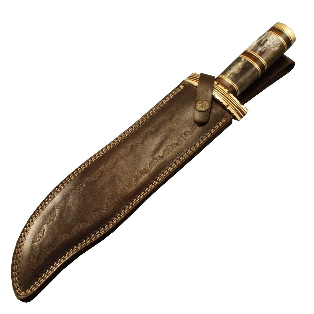 This heavy-duty rock solid knife was purpose-built to withstand years and years of rough and tough use. This masterpiece was custom made only one piece, so grab you a bargain to get this awesome one-of-a-kind knife. Blade of this knife is the result of hours and hours of hammer forging. High carbon steels have been forged in a robust pattern. The blade has superb hand grind on both sides. The spine of the blade has superb fireworks. Fantastic looking rock solid handle of this knife is made of horn and beautifully handcrafted brass piece with red fiber and brass spacers. Its finest fit and finish make this knife very special. This fantastic knife is complemented with a fabulous leather sheath made of original Leather. It is custom made especially for this knife, Hand sewed to provide a perfect fit and finish for this specific knife