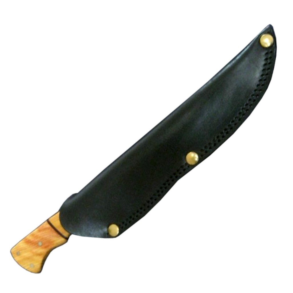 The blade of this awesome knife is made of Damascus steel Billet with high Carbon steel. It has magnificent patterns acquired by forge welding multiple layers of steels and hammering for hours and hours. Fantastic rock solid handle is made of hard wood and beautifully hand crafted brass piece with black fiber spacer bonded together to make master piece of a kind. This knife is complete with a stunning leather sheath made of original Leather. It is custom made especially for this knife, Hand sewn to provide perfect fit and finish for this specific knife. Extra thick leather and strong stitching make this sheath robust which can withstand years of rough and tough use. The sheath can be worn on belt.