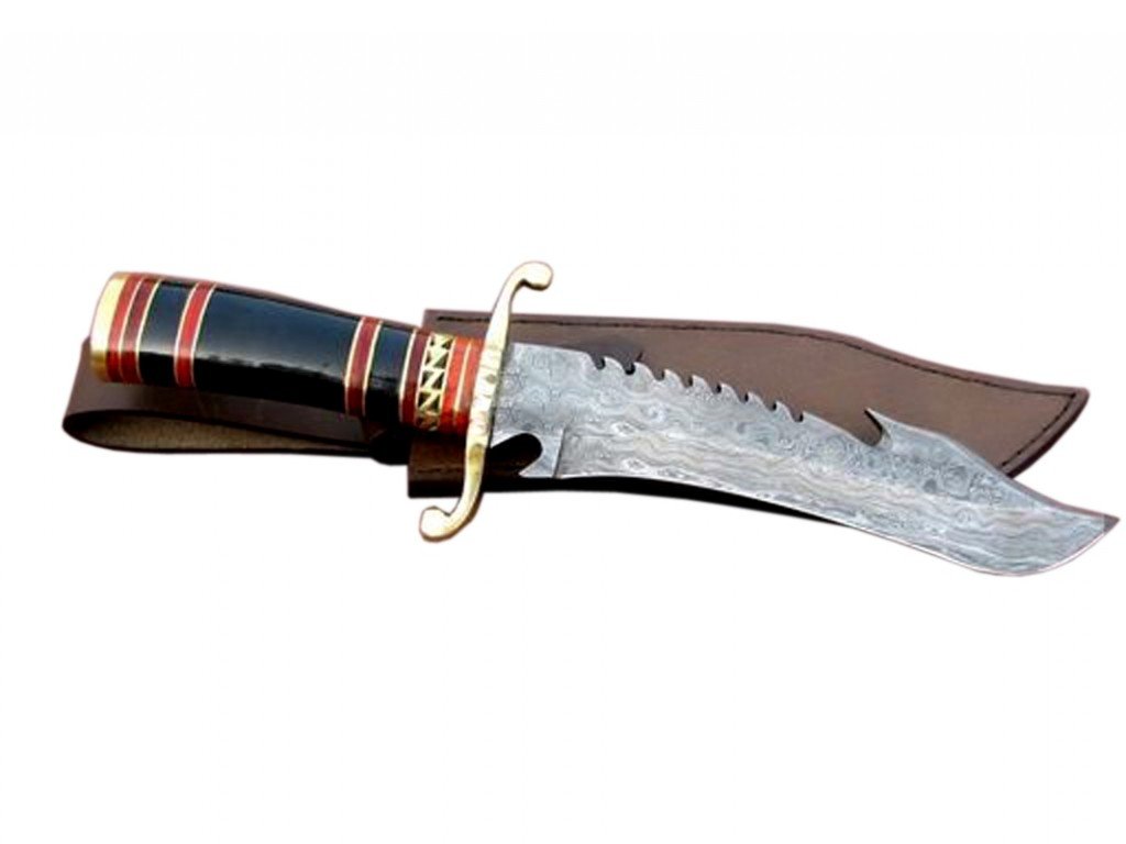 The blade of this awesome knife is made of Damascus steel Billet with high Carbon steel. It has magnificent patterns acquired by forge welding multiple layers of steels and hammering for hours and hours. Fantastic rock solid handle is made of a Buffalo horn and beautifully hand crafted brass piece with brass and red fiber spacers bonded together with brass hand guard is also beautifully hand file worked to make master piece of a kind. This knife is complete with a stunning leather sheath made of original Leather. It is custom made especially for this knife, Hand sewn to provide perfect fit and finish for this specific knife. Extra thick leather and strong stitching make this sheath robust which can withstand years of rough and tough use. The sheath can be worn on belt.
