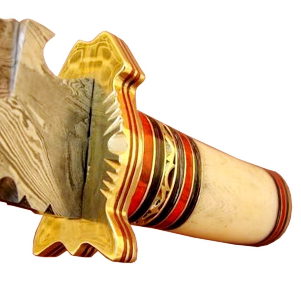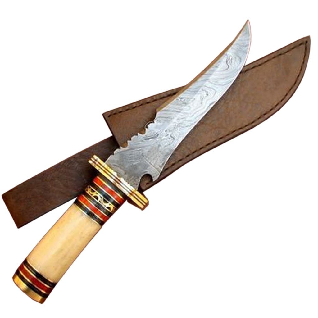 The blade of this awesome knife is made of Damascus steel Billet with high Carbon steel. It has magnificent patterns acquired by forge welding multiple layers of steels and hammering for hours and hours. Fantastic rock solid handle is made of a Bone and beautifully hand crafted brass piece with brass, red and black fiber spacers bonded together with unique fish like brass hand guard is also beautifully hand file worked to make master piece of a kind. This knife is complete with a stunning leather sheath made of original Leather. It is custom made especially for this knife, Hand sewn to provide perfect fit and finish for this specific knife. Extra thick leather and strong stitching make this sheath robust which can withstand years of rough and tough use. The sheath can be worn on belt.