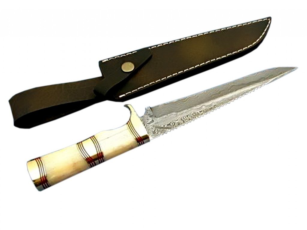 This fantastic knife is a piece of art, with its excellent finish and dashing looks it also got a rock solid construction. Its wonderful blade is the result of hours and hours of hammer forging. The shape and the whole geometry are simply awesome. Blade of this knife was hand forged with high carbon steel layers forged into an excellent pattern. The blade is hand grinned on both sides and each end of the blades has a fabulous symmetrical pattern. Fantastic rock solid handle is made of a unique and rare piece of Buffalo bone with beautifully crafted brass and fiber spacers bonded together to make a master piece of a kind.