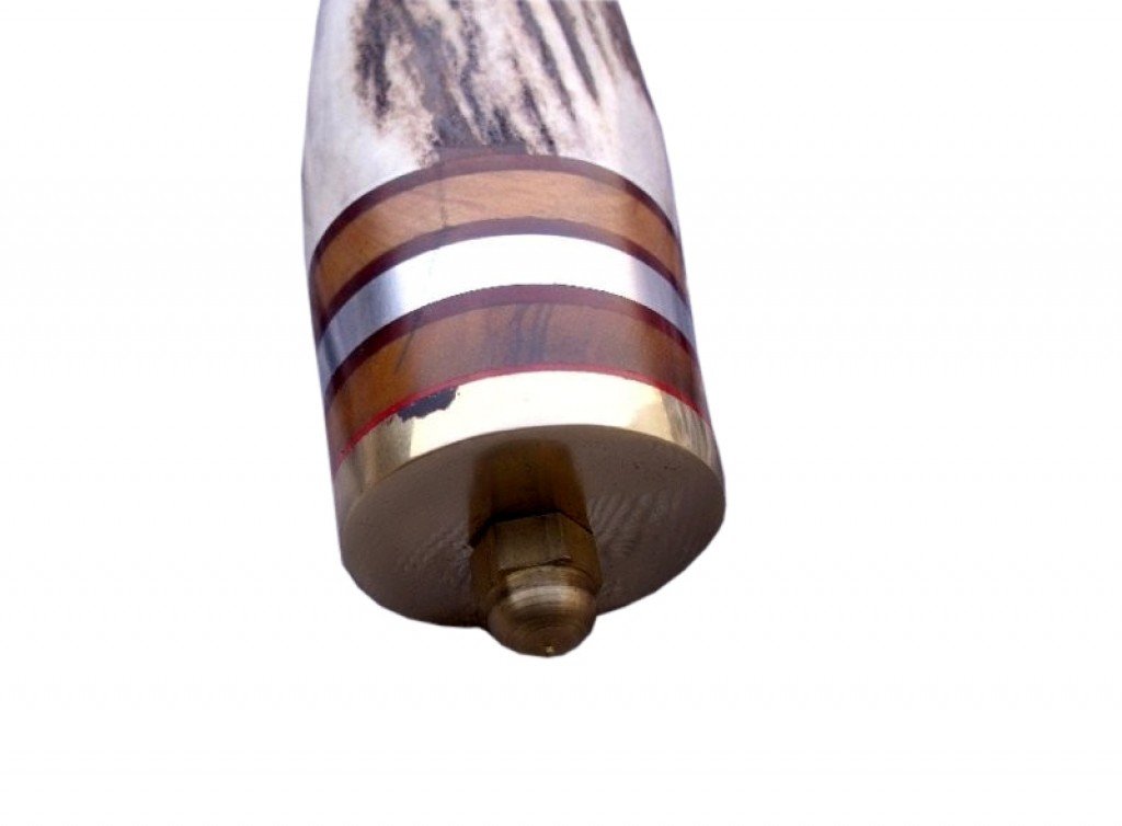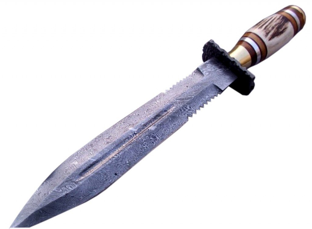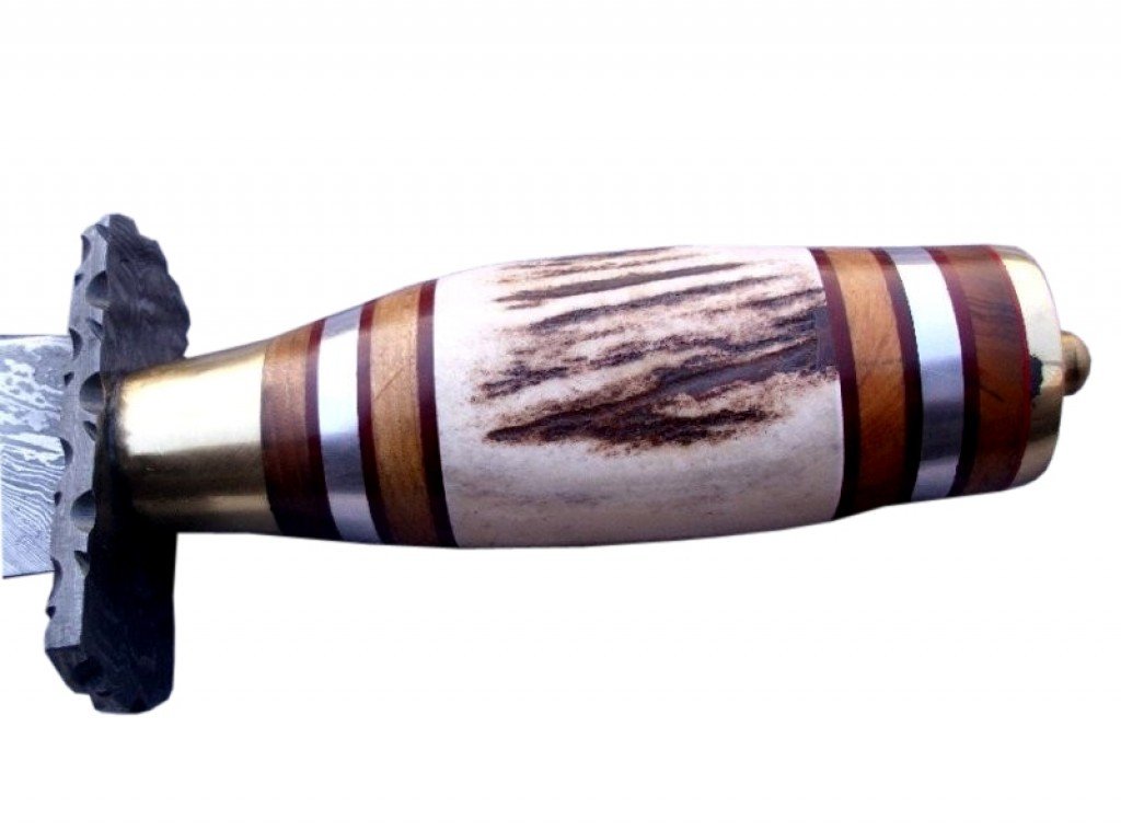 This knife is a unique dagger knife, as it is custom made so grab yourself a bargain to get this splendid knife. This knife is not only stunning in appearance but it also got rock solid construction. Blade of this knife is the result of hours and hours of forging. The Damascus blade of this knife is hand forged with high carbon steels in the fantastic pattern. Not many custom makers can keep such pattern of layers upon layers flowing all the way to the edge, having saw blade effect at a microscopic level which allows the blade to keep cutting for longer period of time where other blades have dulled. Strong 6.50 mm thick blade has superb hand grinds on both sides with stunning fireworks. The handle of this elegant knife is made of solid stag horn with brass and wooden spacers. Its finest fit and finish make this knife very special.